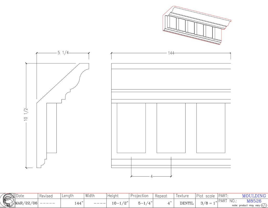 Add a touch of elegance and charm to your home with M8526. Featuring high-quality moulding, this product adds a classic and timeless look to your home's exterior. With the added benefit of fascia dentil, it not only enhances the appearance of your house but also protects it from the elements. Elevate your curb appeal with M8526!
